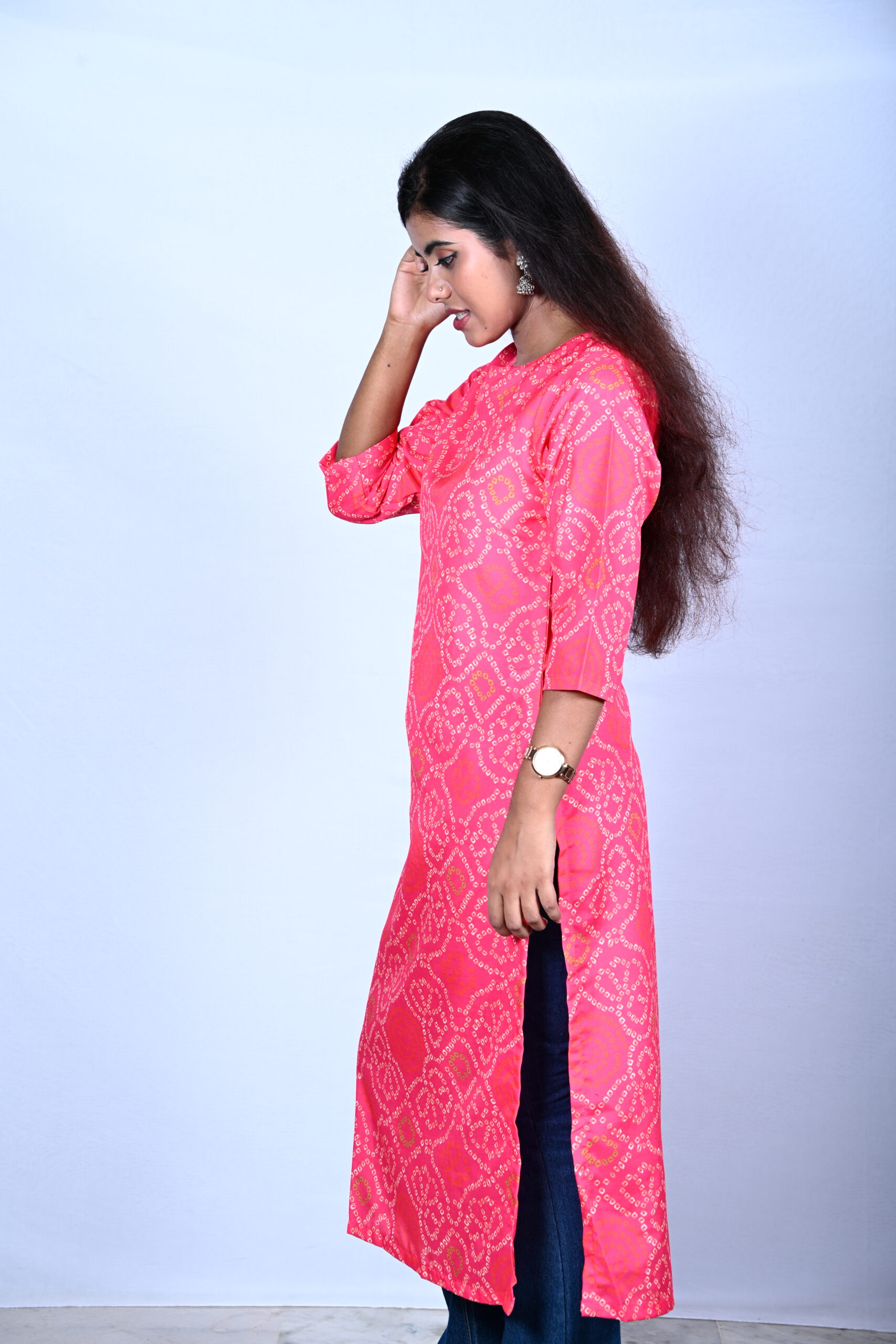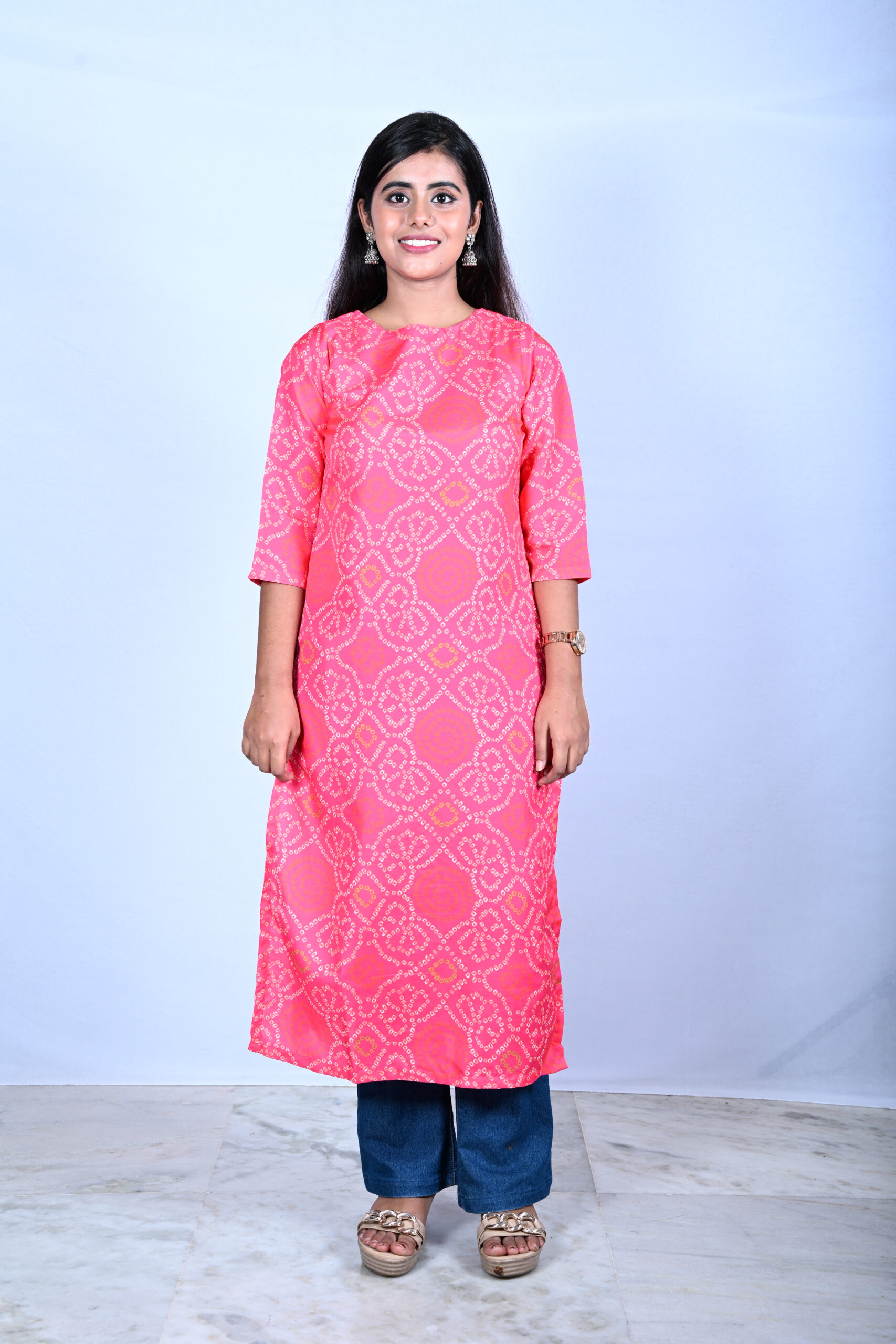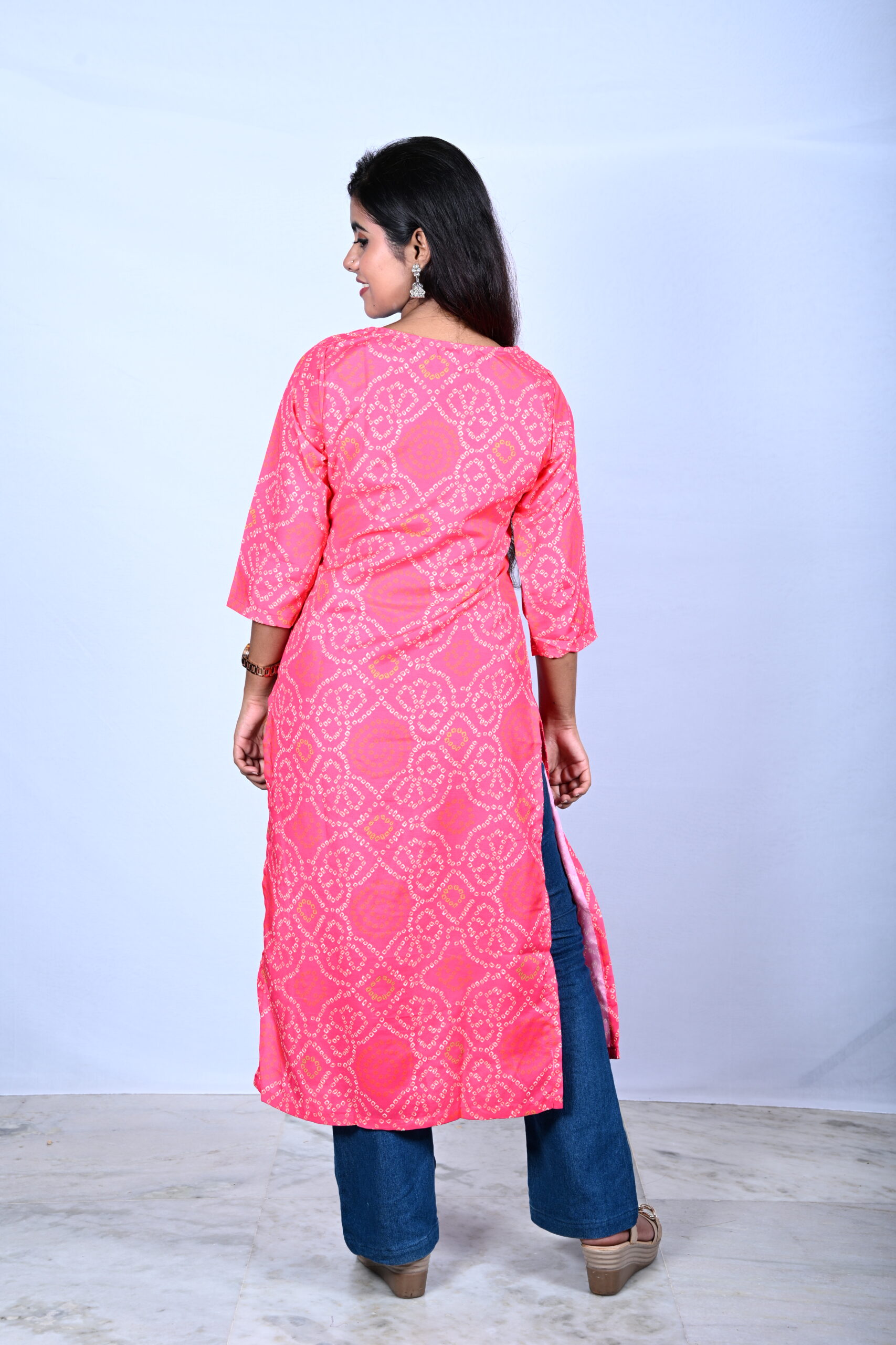 Be the first to review “WOMEN’S RAYON CORAL PINK BANDHINI PRINTED KURTI”